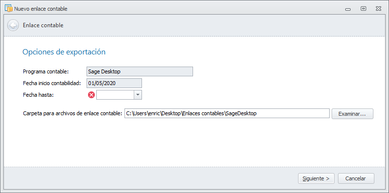 Fecha hasta: Es la fecha hasta la que desea exportar los datos a la contabilidad.