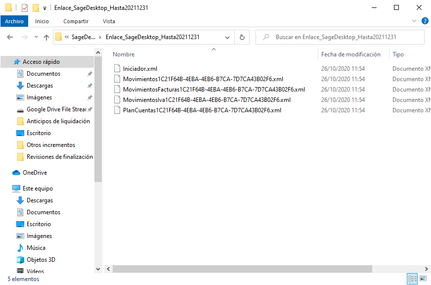 La carpeta generada contiene varios archivos xml con los datos de los asientos en el formato especificado por Sage.