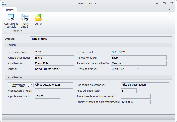 Abrir asiento contable. Muestra el asiento contable correspondiente a esta amortización.