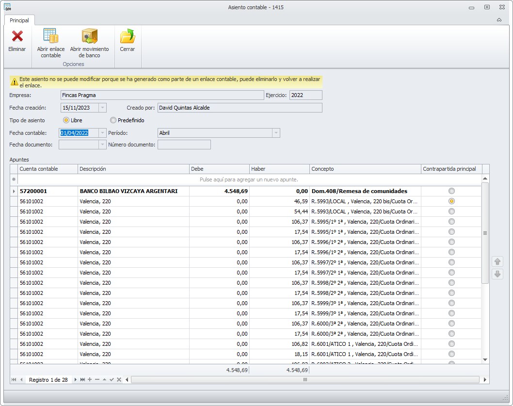 Un asiento que proviene de un enlace contable no se puede modificar, pero sí se puede eliminar.