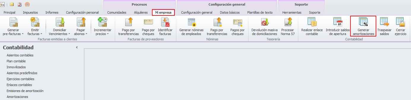 Este proceso calcula y genera los asientos de amortización de los inmovilizados, a partir de los inmovilizados registrados y de la configuración establecida para la amortización en la ficha del ejercicio contable que se procese.