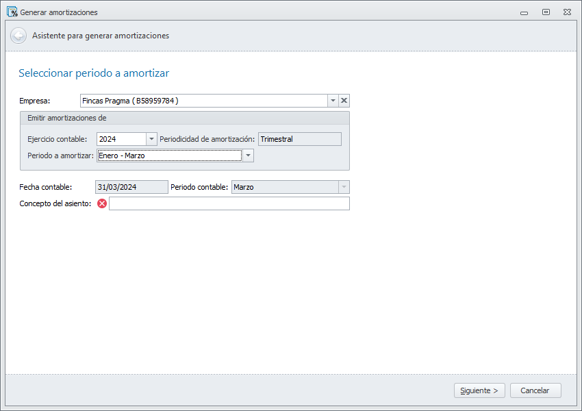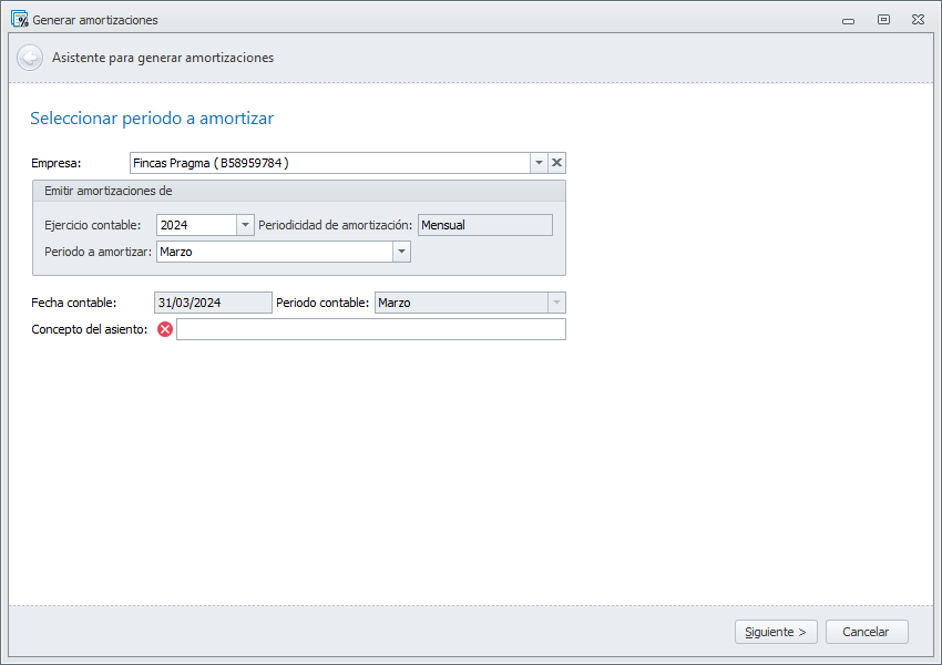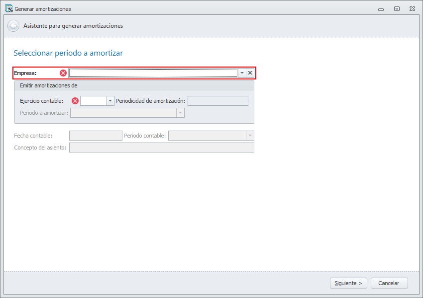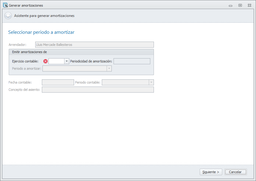 Una vez establecida la empresa que va a procesar, debe escoger el ejercicio contable y cumplimentar el resto de datos de la primera ventana. Los datos que se solicitan varían dependiendo de la periodicidad establecida para las amortizaciones en la ficha del ejercicio contable escogido. Haga clic aquí para más información sobre el ejercicio contable.