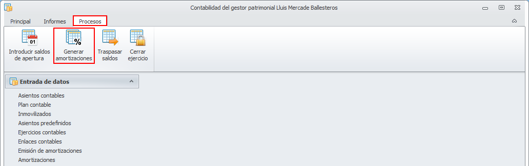 Para generar amortizaciones, vaya a la ventana Contabilidad del gestor patrimonial y, desde el menú Procesos, acceda a la opción Generar amortizaciones.