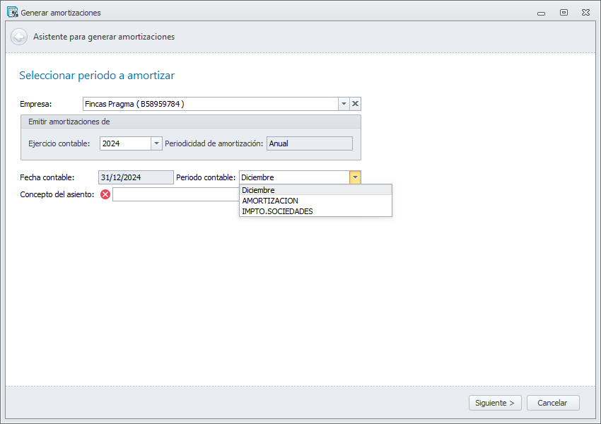 Periodo contable. Permite escoger entre “Diciembre” y cualquiera de los periodos contables configurables definidos en la ficha del ejercicio contable. Haga clic aquí para más información sobre los periodos contables configurables.