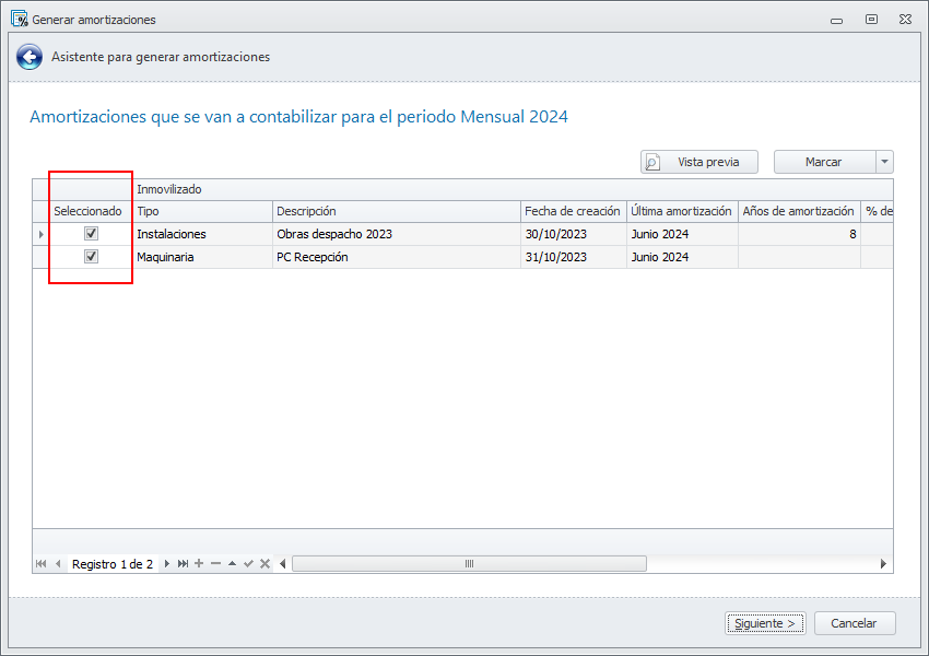 Si para alguno de los inmovilizados no desea contabilizar su amortización, desmarque la casilla Seleccionado.