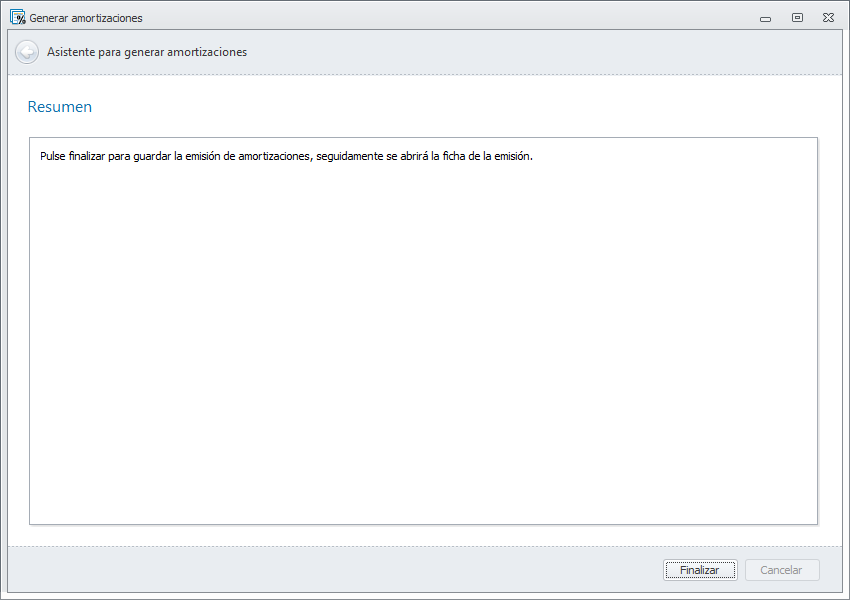 Al pulsar Finalizar en la siguiente ventana, se registran las amortizaciones y se contabilizan los correspondientes asientos.