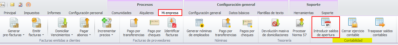 Para introducir los saldos de apertura de una empresa, vaya al menú Procesos / Mi empresa y haga clic en la opción Introducir saldos de apertura.