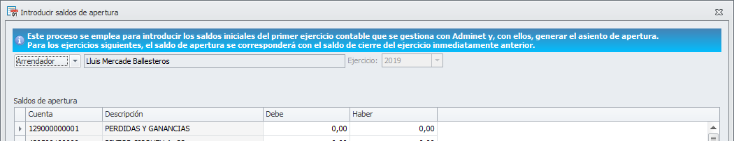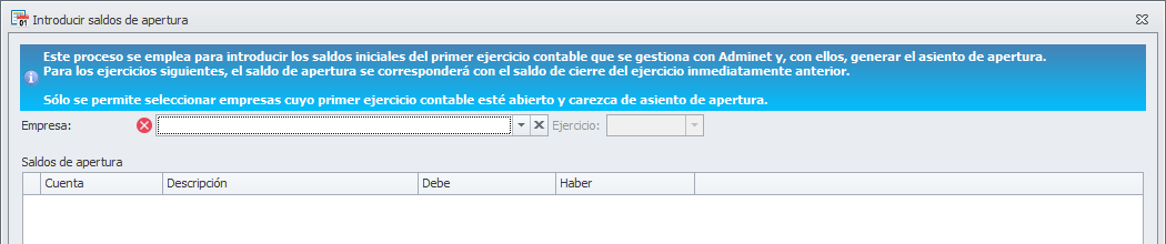 El proceso Introducir saldos de apertura se emplea para introducir los saldos iniciales del primer ejercicio contable que se gestiona con Adminet.