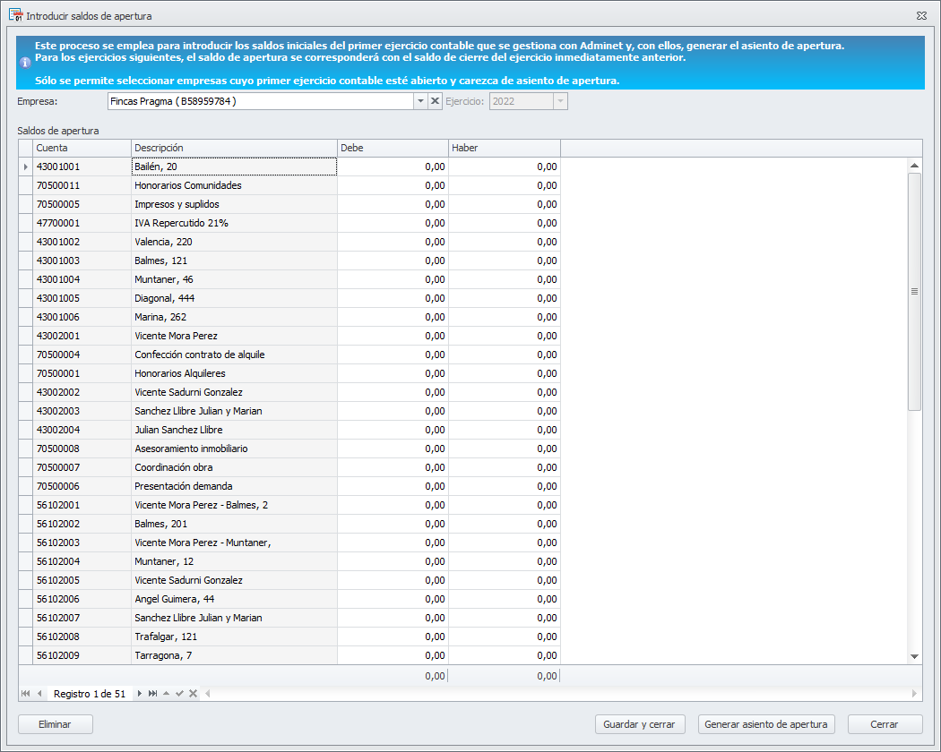 Guardar y cerrar. Permitirá guardar los datos introducidos sin generar todavía el asiento de apertura. Más adelante podrá volver a retomar la introducción allí donde la dejó.