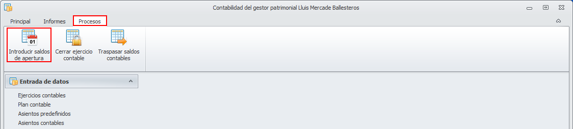 Para introducir los saldos de apertura, vaya a la ventana Contabilidad del gestor patrimonial y, desde el menú Procesos, acceda a la opción Introducir saldos de apertura.