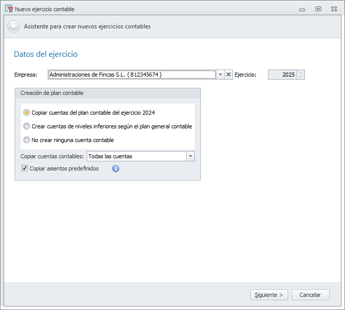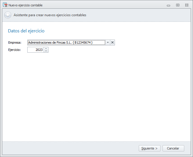 Se abrirá el asistente de nuevo ejercicio, teniendo preseleccionada la empresa escogida.