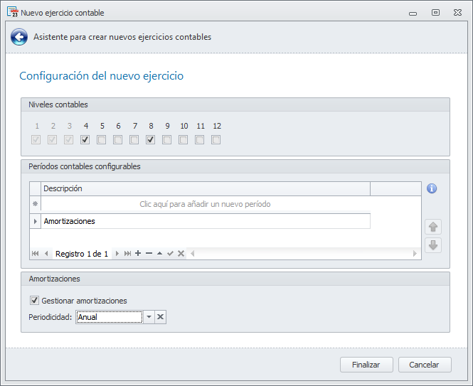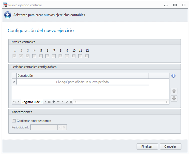 Si en la ventana anterior escogió Crear cuentas de niveles inferiores según el plan general contable o No crear ninguna cuenta contable , los niveles 1, 2 y 3 serán obligatorios y podrá personalizar para este ejercicio el resto de niveles.