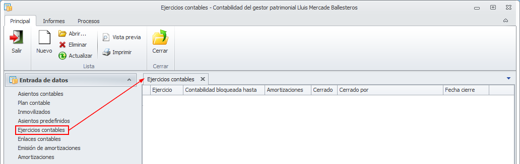 Para abrir un nuevo ejercicio contable, vaya a la ventana Contabilidad del gestor patrimonial y, desde el menú Principal, acceda a la opción Ejercicios contables.