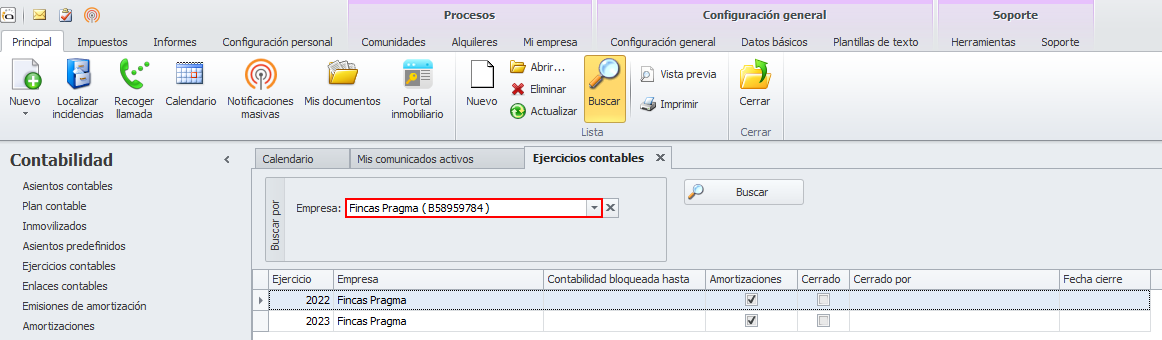 Al finalizar, se abre la ficha de ese ejercicio contable. Haga clic aquí para más información sobre la ficha del ejercicio contable.