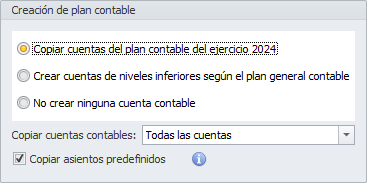 Copiar asientos predefinidos. Si lo activa, se copiarán los asientos predefinidos del ejercicio anterior de esa misma empresa. Se recomienda activar esa opción, a no ser que se desee cambiar notablemente la forma de contabilizar de la empresa.