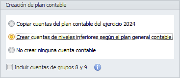 Copiar cuentas del plan contable del ejercicio xxxx. Permite generar el plan de cuentas del nuevo ejercicio copiándolo del plan de cuentas del ejercicio anterior de esa misma empresa. Escogiendo esta opción se solicita también: