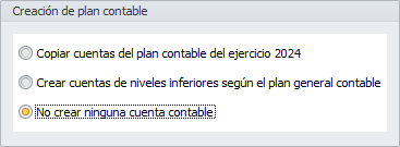 No crear ninguna cuenta contable. Creará el ejercicio contable pero dejará el plan de cuentas vacío. Esta opción se usará si no se desea tener un plan contable completo y se desea añadir las cuentas manualmente.