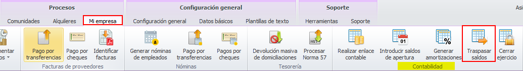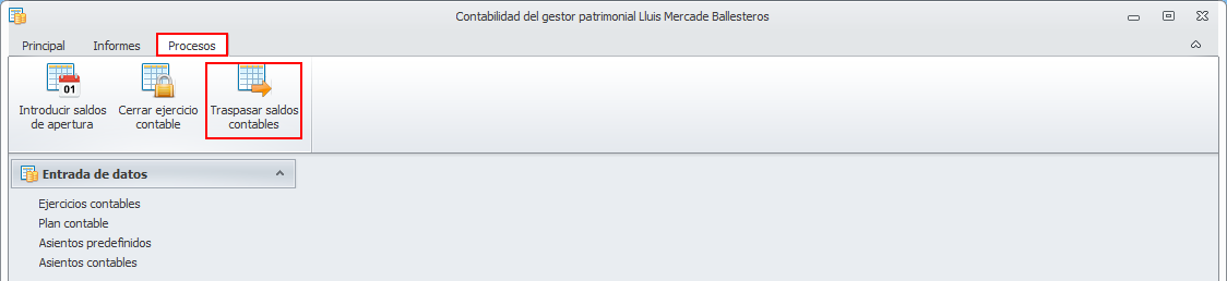 Para cerrar un ejercicio contable, vaya a la ventana Contabilidad del gestor patrimonial y, desde el menú Procesos, acceda a la opción Traspasar saldos contables.