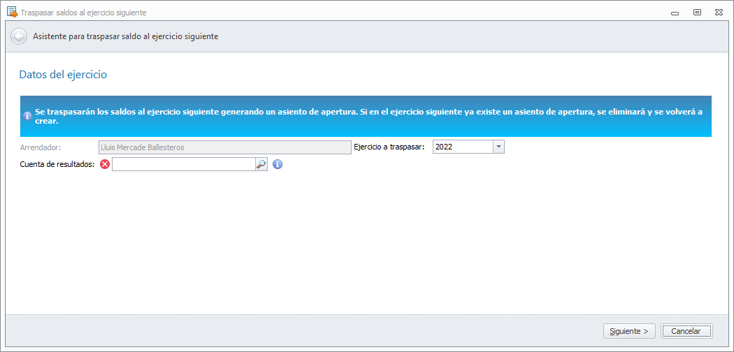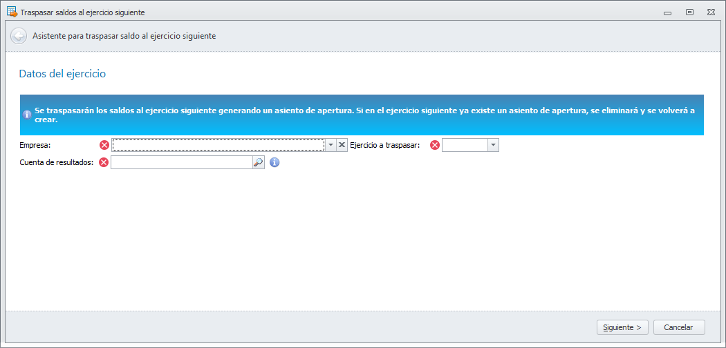 Para poder traspasar saldos de un ejercicio al siguiente, debe estar abierto el ejercicio siguiente. Haga clic aquí para ver cómo abrirlo.