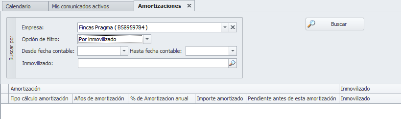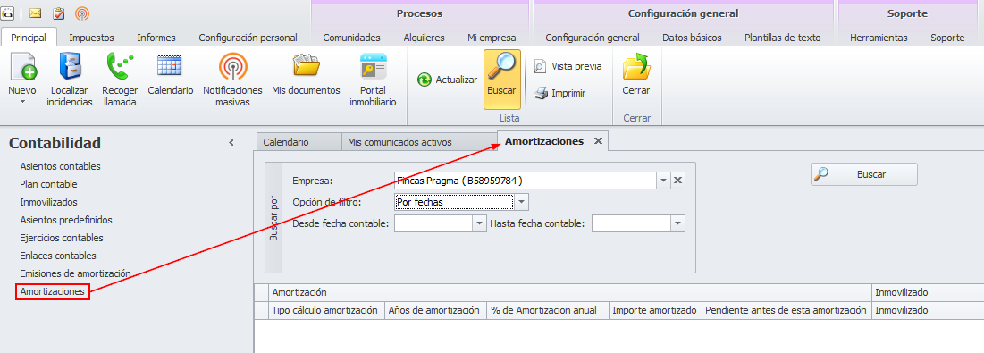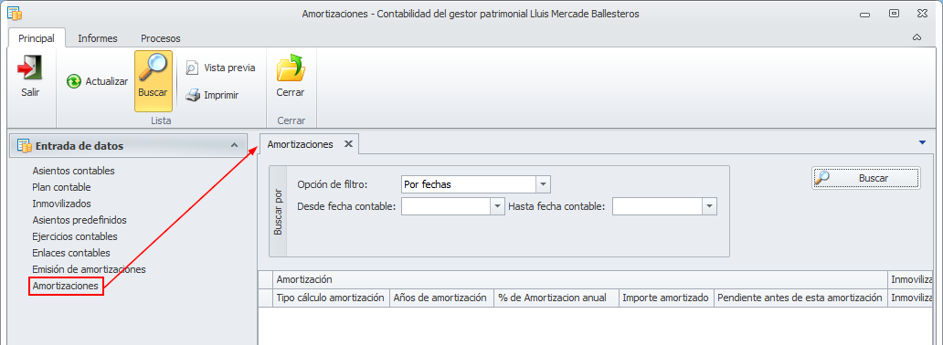 Para acceder a la vista de amortizaciones, vaya a la ventana Contabilidad del gestor patrimonial y, desde el menú Principal, acceda a la opción Amortizaciones.
