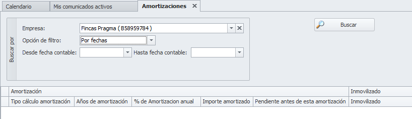 Desde fecha contable / Hasta fecha contable. Mostrará sólo las amortizaciones contabilizadas entre las fechas desde y hasta introducidas en pantalla.
