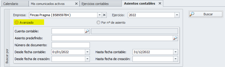Asiento predefinido. Puede seleccionar un asiento predefinido para que se muestren únicamente los registrados mediante este predefinido y que cumplen con el resto de filtros.