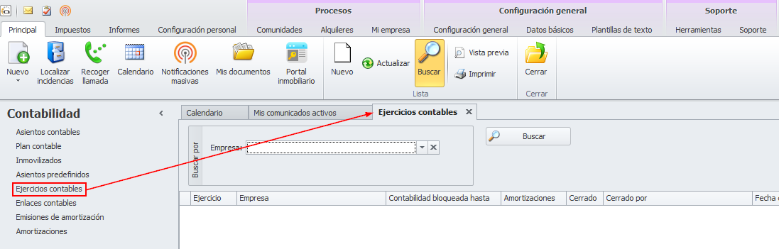 Para acceder a la vista de ejercicios contables, vaya a la ventana Contabilidad del gestor patrimonial y, desde el menú Principal, acceda a la opción Ejercicios contables.