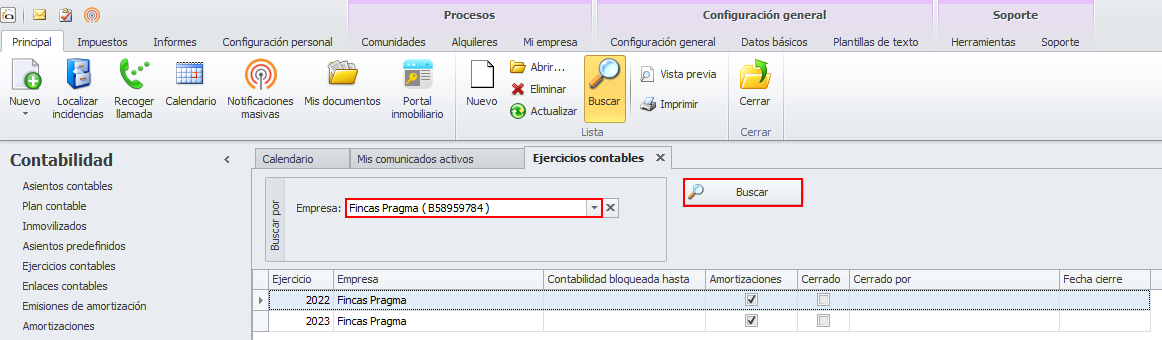 Haciendo doble clic sobre un ejercicio, se abre su ficha. Haga clic aquí para ver el contenido de la ficha de un ejercicio contable.