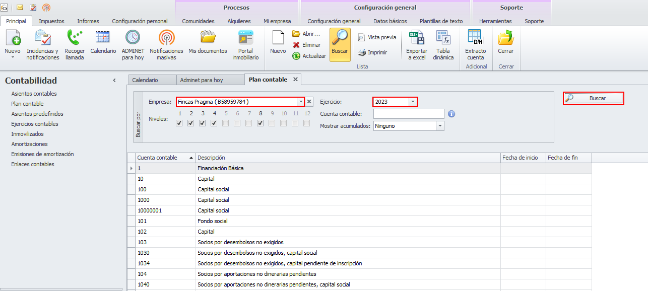 Para acceder a la vista del plan contable y la lista de cuentas, sitúese en el apartado Contabilidad y acceda a la opción Plan contable.