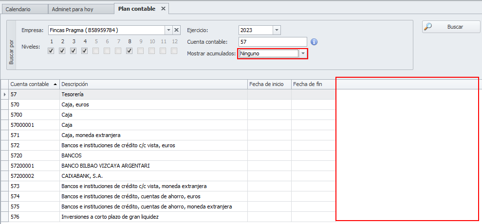 La casilla Cuenta contable permite introducir los dígitos iniciales de las cuentas a buscar. Una vez escritos haga clic en Buscar para activar el filtrado.