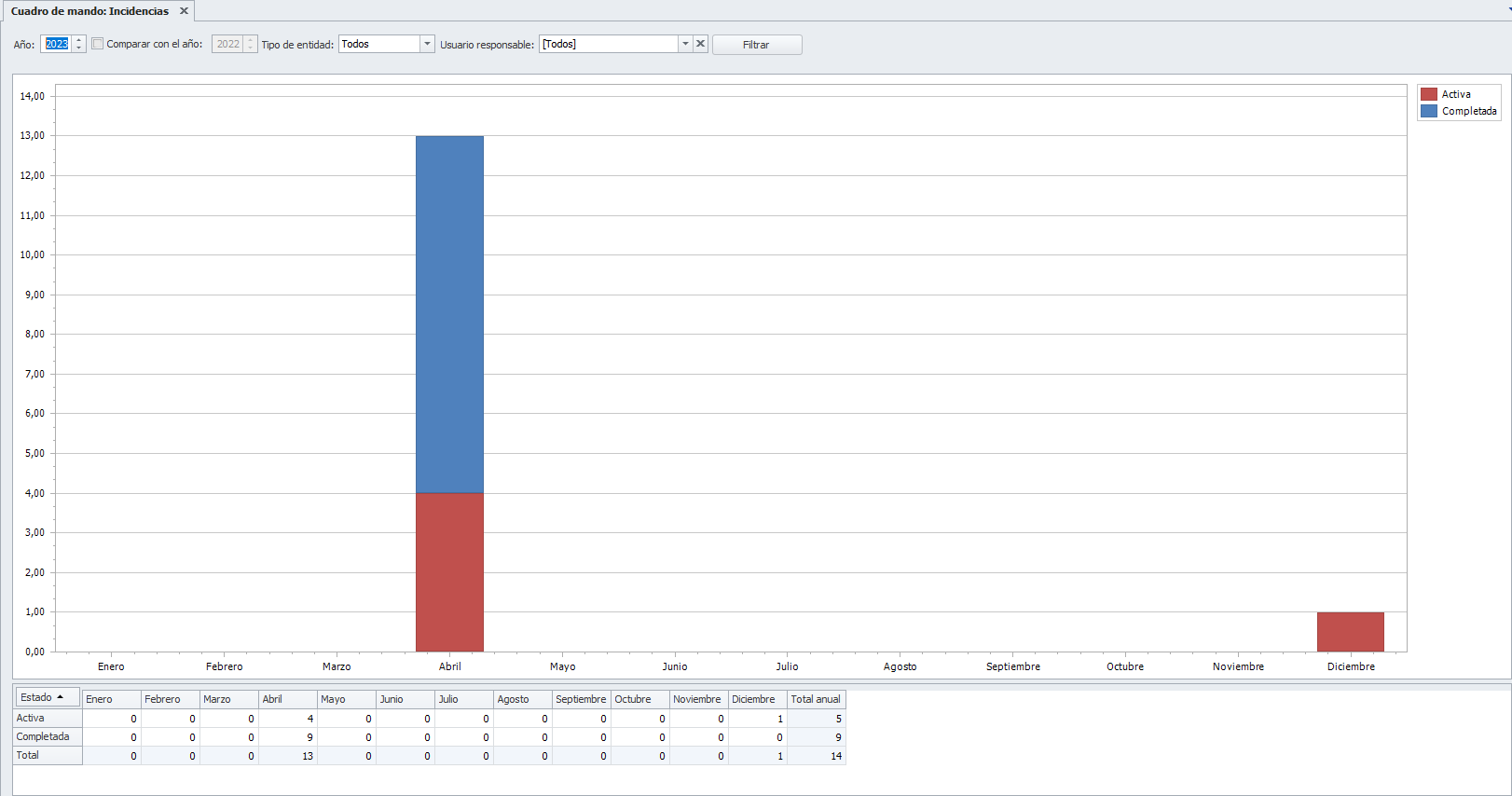 Permite distinguir entre comunidades, alquileres, clientes o mostrar los valores consolidados. También permite filtrar por usuario asignado a la incidencia. En los gráficos se distingue, en diferentes colores, las incidencias activas y completadas.