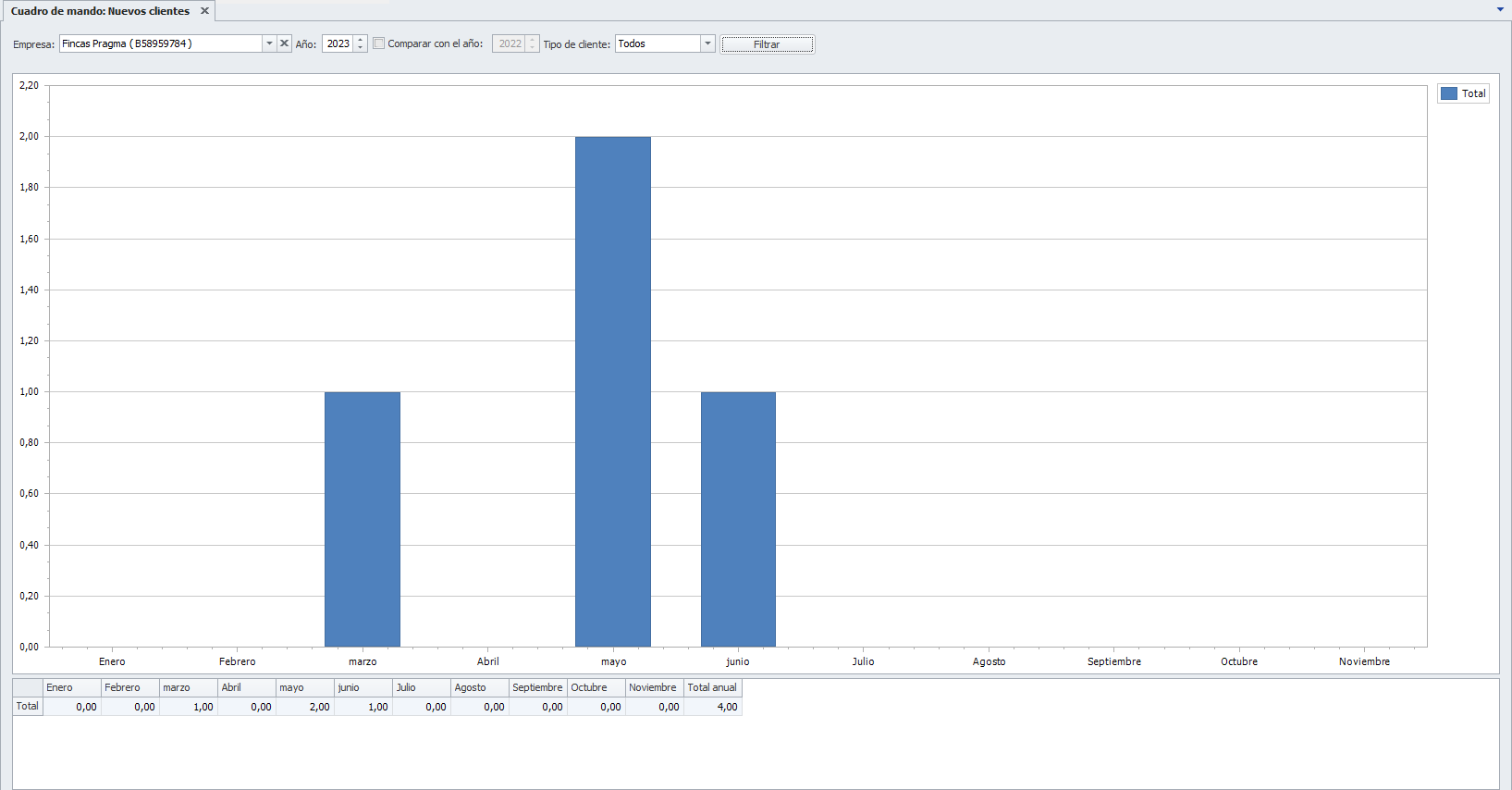 La estadística de nuevos clientes informa el número de clientes dados de alta cada mes por el administrador. Se genera el informe en base a la casilla Fecha de alta de la ficha de cliente.