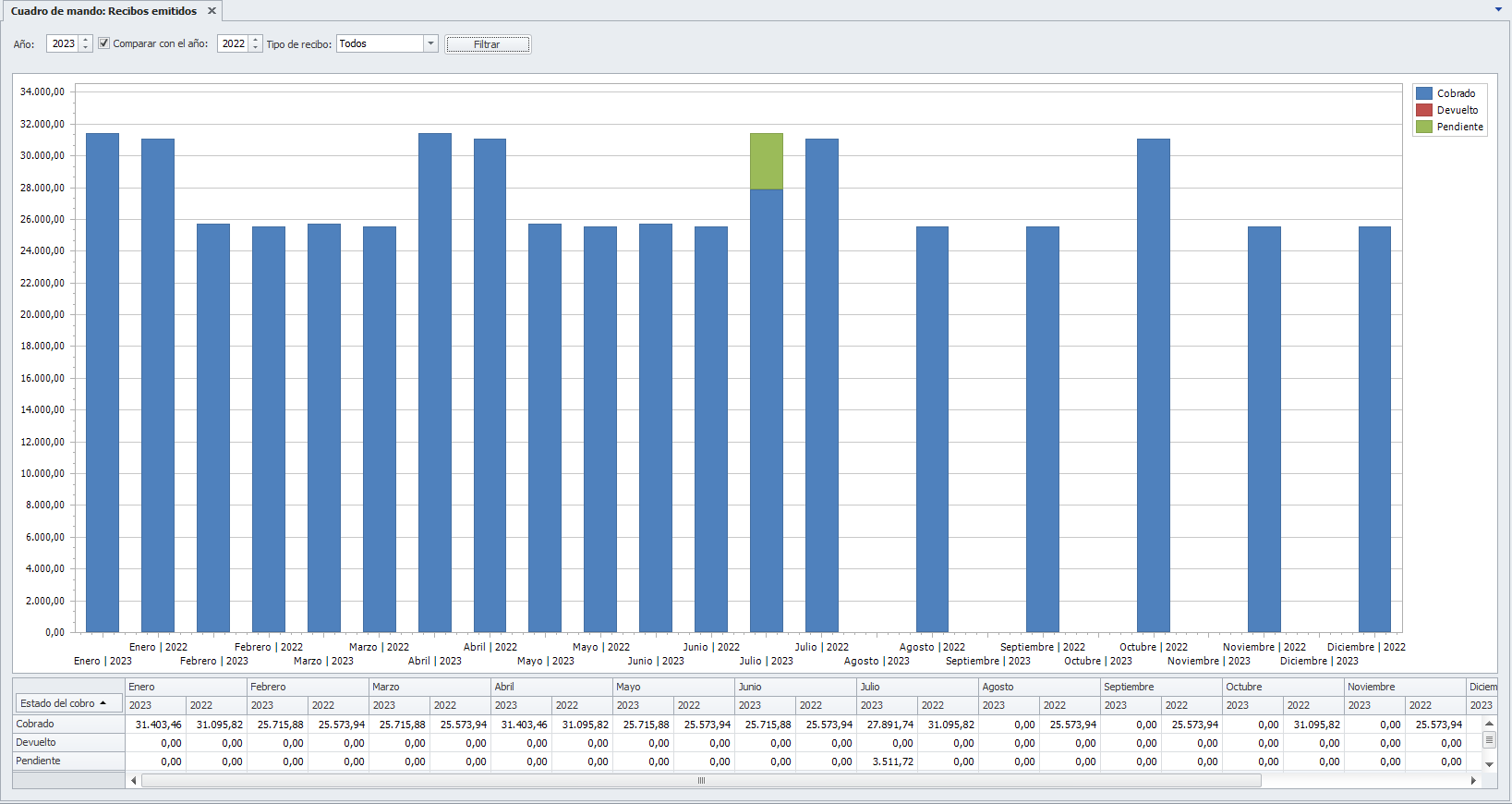 Permite distinguir entre comunidades, alquileres o mostrar los valores consolidados. En los gráficos se distingue, en diferentes colores, los recibos cobrados, pendientes y devueltos.
