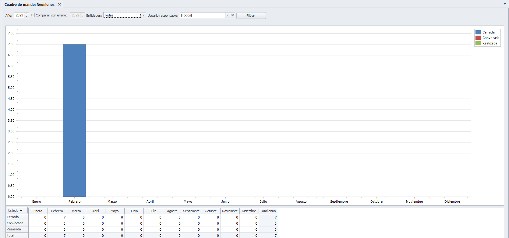 Permite distinguir entre comunidades, macrocomunidades o mostrar los valores consolidados. También permite filtrar por usuario asignado a la comunidad. En los gráficos, se distinguen las reuniones en diferentes colores, según si su estado es cerrada, convocada o realizadas.