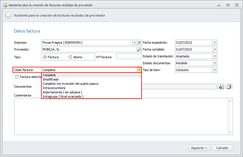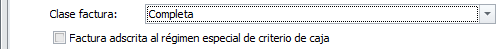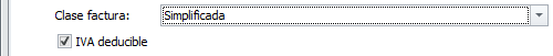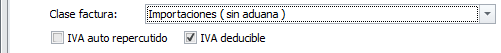En las facturas de compra, la casilla Clase factura determina como se debe tratar esta factura en la declaración de impuestos, principalmente en los modelos 303, 390 y 347. Según el tipo escogido se solicitan otros campos relacionados con el tratamiento del IVA.