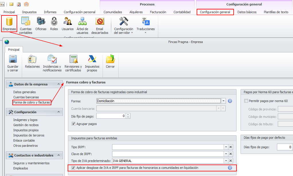 En la ficha de Empresa se dispone de la casilla Aplicar desglose de IVA para facturas de honorarios a comunidades en liquidación.