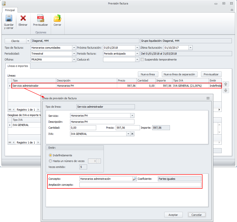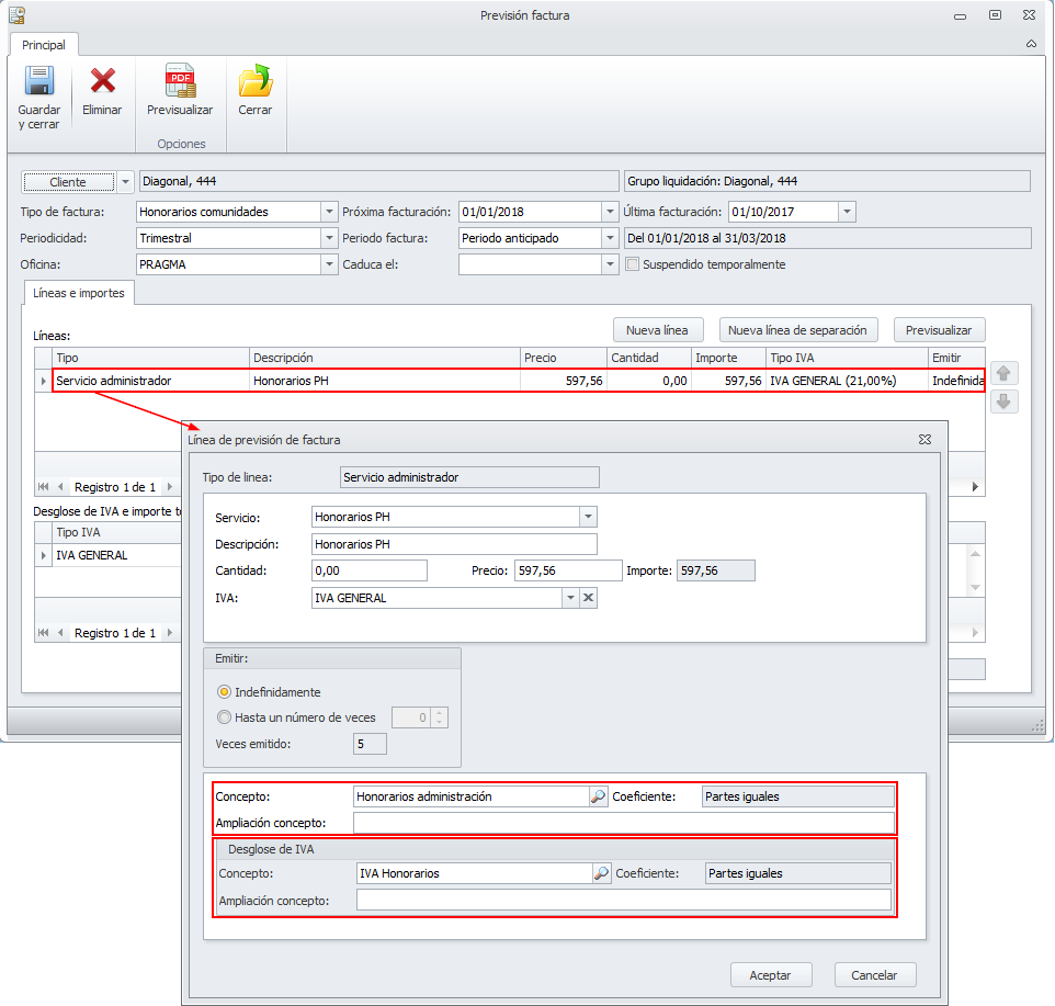 De este modo (teniendo activada la casilla Aplicar desglose de IVA para facturas de honorarios a comunidades en liquidación) se desglosará la base y el IVA de los honorarios en todas las facturas excepto en aquellas en las que se indique el mismo concepto para ambos importes.