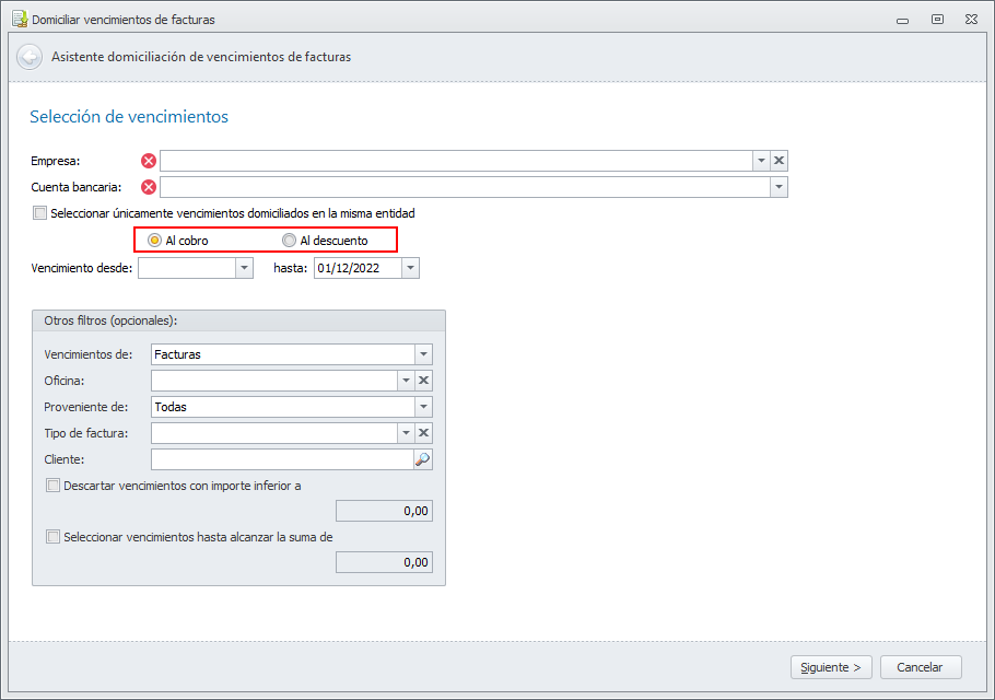 Al activar esta casilla, el proceso de domiciliación de vencimientos del administrador solicita si la domiciliación es al cobro o al descuento.