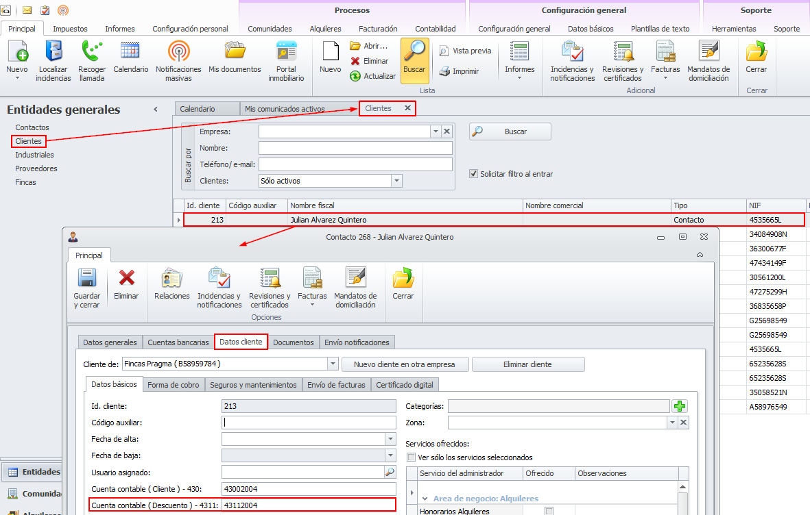 Además, las fichas de clientes solicitan la cuenta en la que se debe registrar el asiento de la domiciliación durante el tiempo que va desde la domiciliación hasta el vencimiento de las facturas.