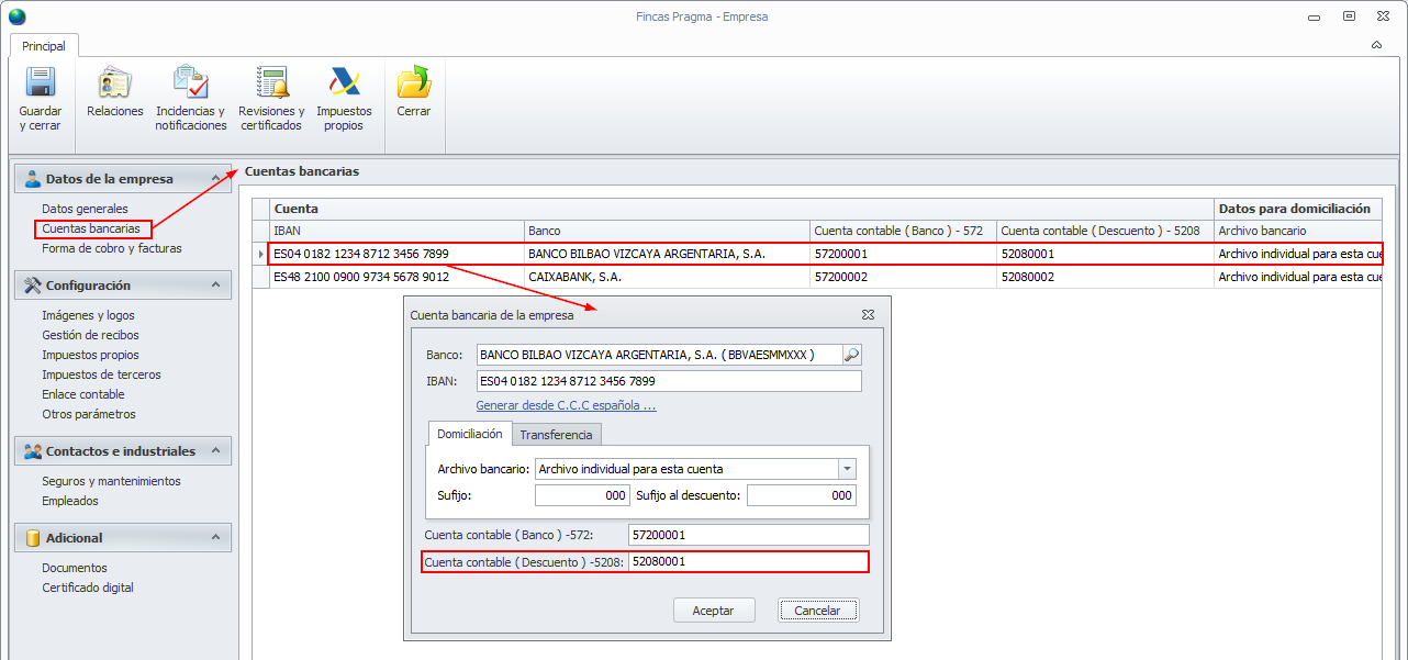 También, en la ficha de las cuentas bancarias del administrador, se solicita la cuenta en la que se debe registrar el asiento de la domiciliación durante el tiempo que va desde la domiciliación hasta el vencimiento de las facturas.