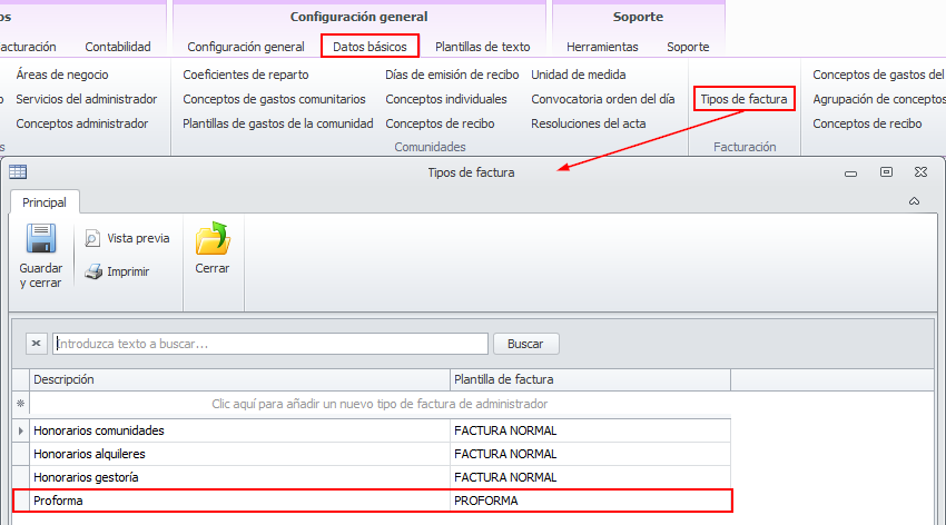 En el menú Datos básicos vaya a Tipos de factura y añada un nuevo tipo con la descripción Proforma y asígnele la plantilla de factura PROFORMA.