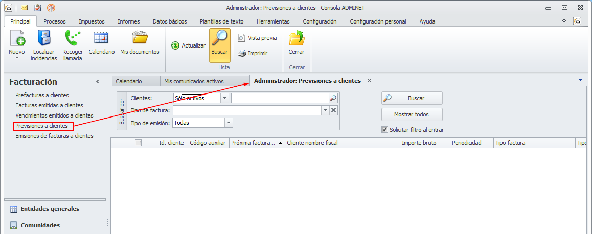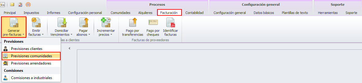 Cuando desee emitir las facturas de honorarios a partir de estas previsiones introducidas, vaya al menú Procesos, escoja Facturación, haga clic en el botón Generar Pre-facturas y elija Previsiones comunidades.
