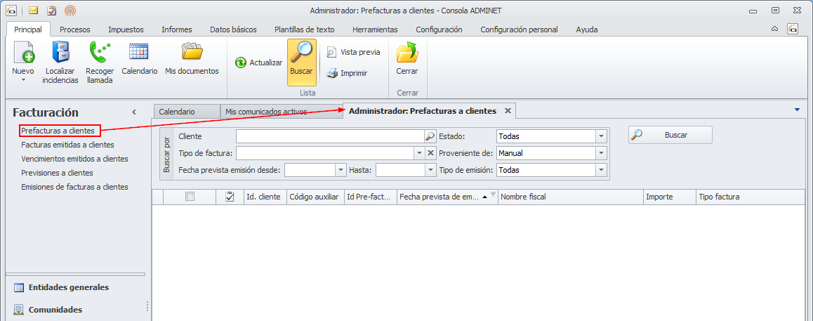 Para introducir los datos de una factura que desee emitir, vaya al apartado Facturación y haga clic en Pre-facturas a clientes.
