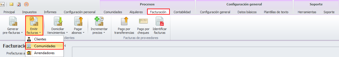 Vaya al menú Procesos, escoja Facturación, haga clic en el botón Emitir facturas y elija Comunidades.