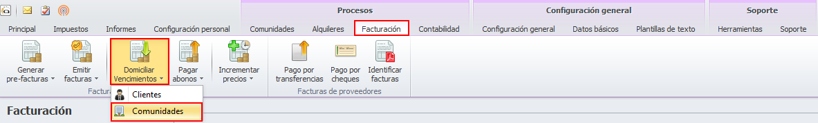 En el caso de que alguna de las comunidades a las que ha emitido facturas se administre con cuenta bancaria propia, deberá realizar la domiciliación bancaria para generar el archivo SEPA, remitirlo a su entidad bancaria y contabilizar el cobro de esas facturas. Deberá hacerlo accediendo al menú Procesos, escogiendo Facturación, haciendo clic en el botón Domiciliar vencimientos y eligiendo Comunidades.