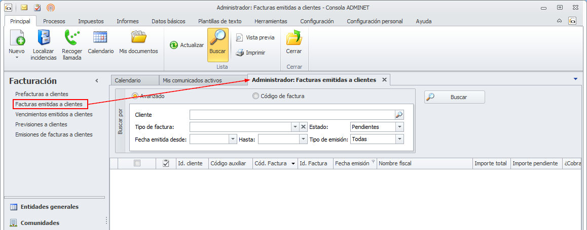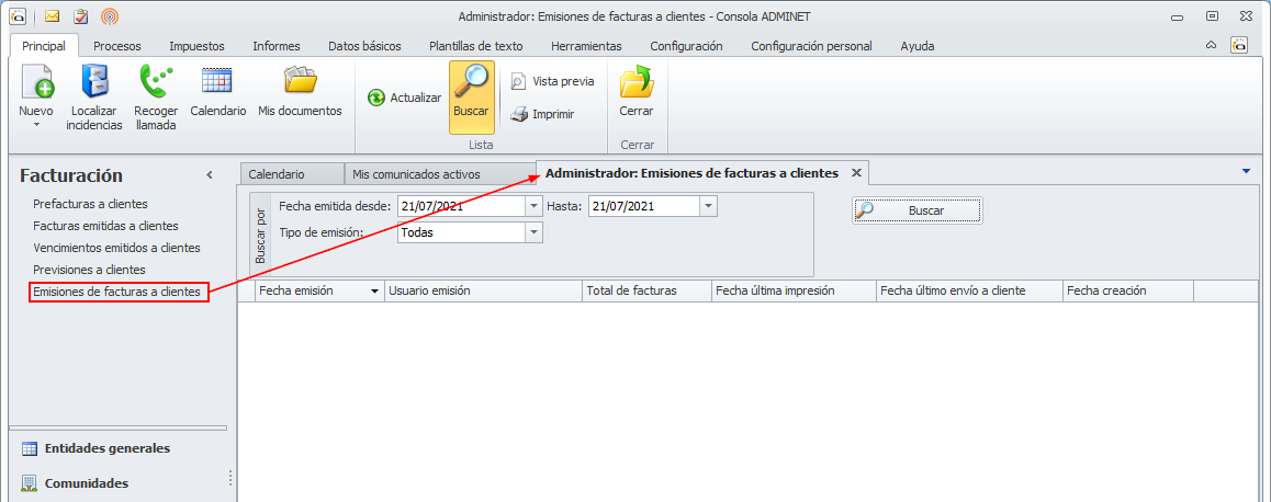Si desea ver las diferentes emisiones de facturas a comunidades realizadas, vaya a la opción Emisiones de facturas a clientes del apartado Facturación.