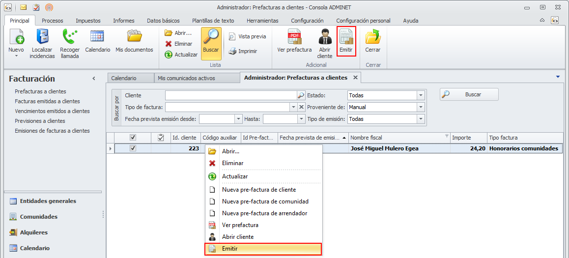 También puede marcar las facturas que desee emitir y hacer clic en el botón Emitir de la parte superior de la ventana.