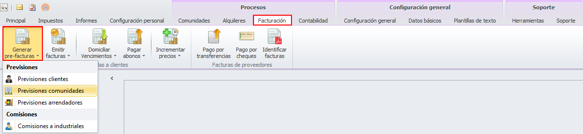 Acceda al menú Procesos, escoja Facturación, haga clic en el botón Generar pre-facturas y escoja una entre las diferentes opciones que se ofrecen.