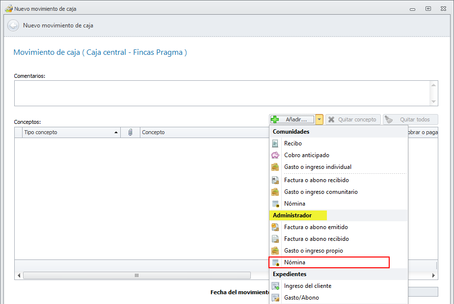 Al registrar un movimiento de caja, entre las opciones del apartado Administrador se tiene disponible la opción Nómina.