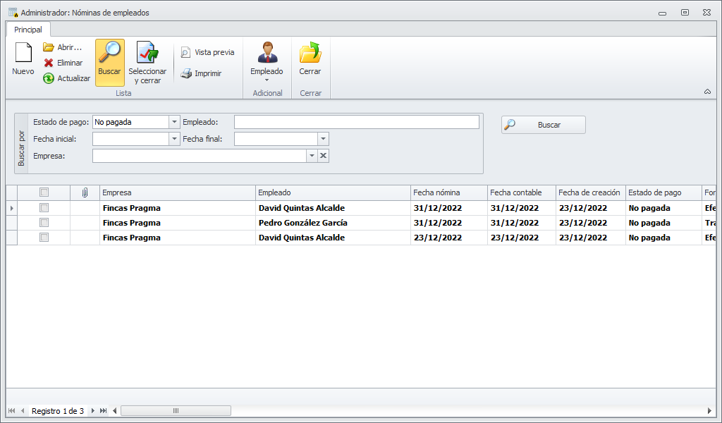 Al escoger esta opción, se muestran los registros de nóminas de empleados del administrador pendientes de pagar para que el usuario escoja la que desee.